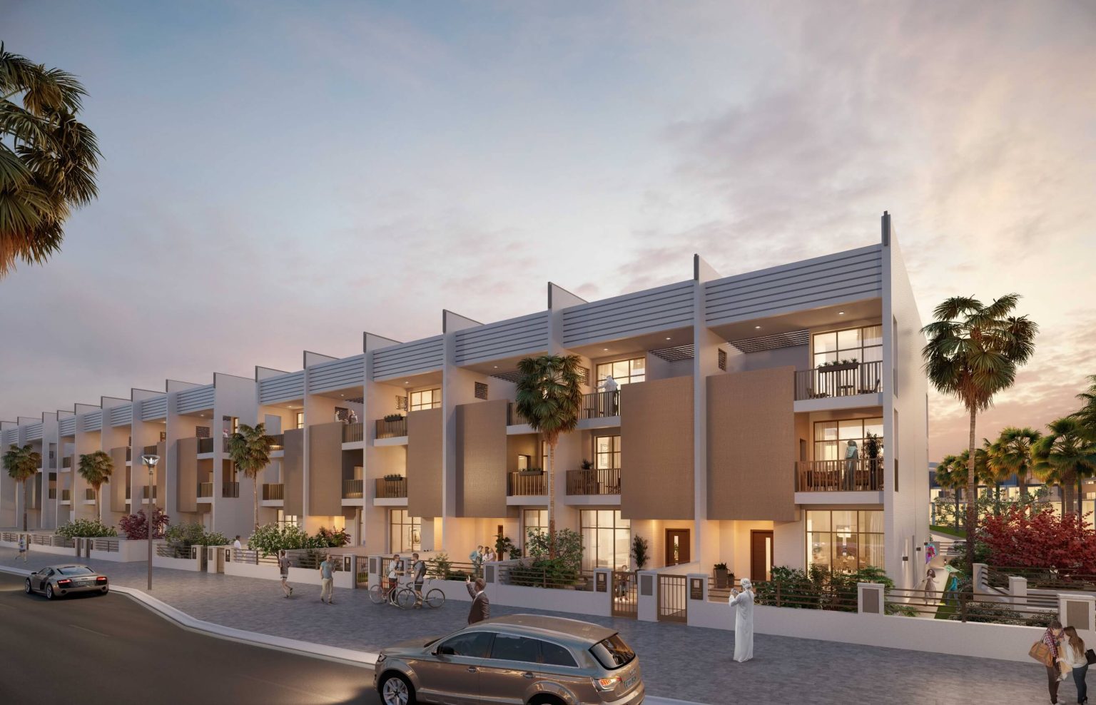 Somerset Mews features refined and contemporary townhouses in Dubai, with a striking facade in earth tones that emphasizes ample private balconies and abundant natural light.